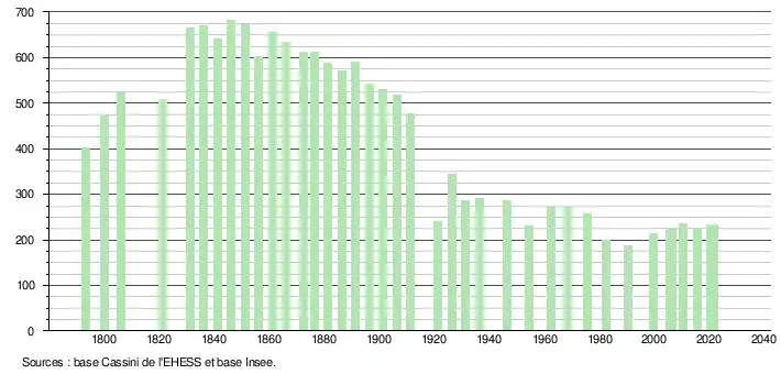 L'évolution du nombre d'habitants est connue à travers les recensements de la population effectués dans la commune depuis 1793. Pour les communes de moins de 10 000 habitants, une enquête de recensement portant sur toute la population est réalisée tous les cinq ans, les populations légales des années intermédiaires étant quant à elles estimées par interpolation ou extrapolation[16]. Pour la commune, le premier recensement exhaustif entrant dans le cadre du nouveau dispositif a été réalisé en 2005[17].