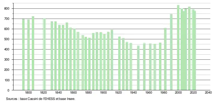 L'évolution du nombre d'habitants est connue à travers les recensements de la population effectués dans la commune depuis 1793. Pour les communes de moins de 10 000 habitants, une enquête de recensement portant sur toute la population est réalisée tous les cinq ans, les populations légales des années intermédiaires étant quant à elles estimées par interpolation ou extrapolation[43]. Pour la commune, le premier recensement exhaustif entrant dans le cadre du nouveau dispositif a été réalisé en 2004[44].