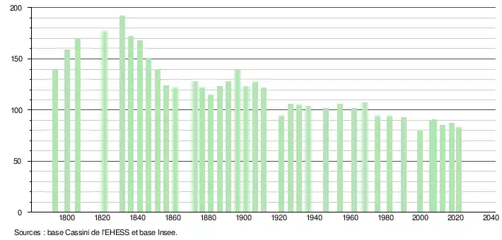 L'évolution du nombre d'habitants est connue à travers les recensements de la population effectués dans la commune depuis 1793. Pour les communes de moins de 10 000 habitants, une enquête de recensement portant sur toute la population est réalisée tous les cinq ans, les populations légales des années intermédiaires étant quant à elles estimées par interpolation ou extrapolation[30]. Pour la commune, le premier recensement exhaustif entrant dans le cadre du nouveau dispositif a été réalisé en 2007[31].
