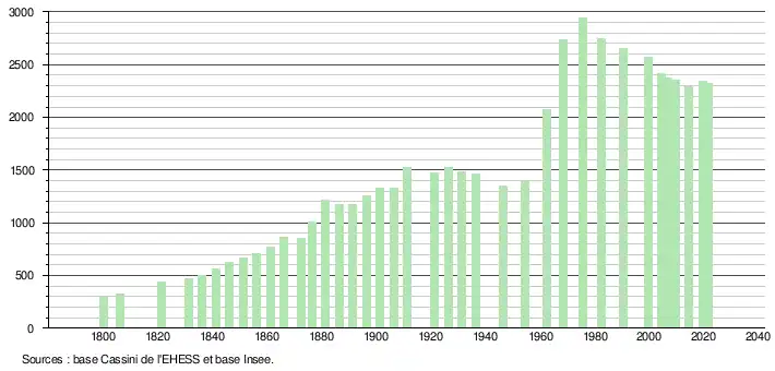 L'évolution du nombre d'habitants est connue à travers les recensements de la population effectués dans la commune depuis 1800. Pour les communes de moins de 10 000 habitants, une enquête de recensement portant sur toute la population est réalisée tous les cinq ans, les populations légales des années intermédiaires étant quant à elles estimées par interpolation ou extrapolation[25]. Pour la commune, le premier recensement exhaustif entrant dans le cadre du nouveau dispositif a été réalisé en 2004[26].