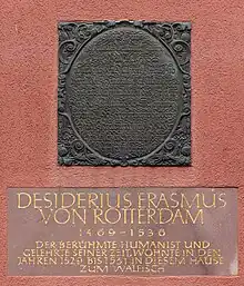 Comme l'indique la façade du bâtiment, l'humaniste Érasme de Rotterdam a vécu dans la maison Villinger après son évasion de Bâle. Cependant, lors de son arrivée à Noël 1529, la maison n'était toujours pas achevée[14].