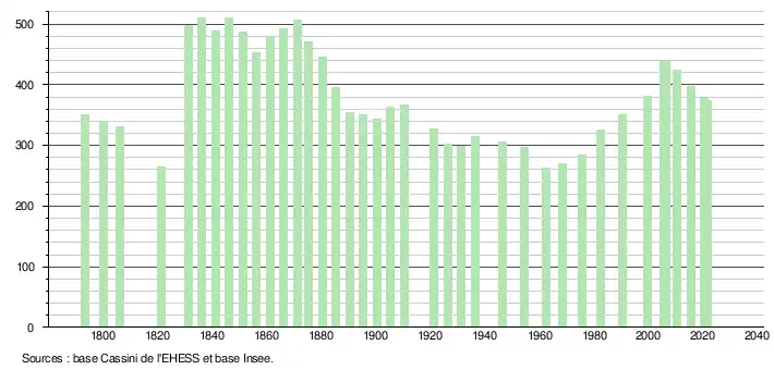 L'évolution du nombre d'habitants est connue à travers les recensements de la population effectués dans la commune depuis 1793. Pour les communes de moins de 10 000 habitants, une enquête de recensement portant sur toute la population est réalisée tous les cinq ans, les populations légales des années intermédiaires étant quant à elles estimées par interpolation ou extrapolation[16]. Pour la commune, le premier recensement exhaustif entrant dans le cadre du nouveau dispositif a été réalisé en 2005[17].
