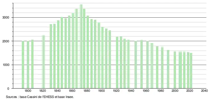 L'évolution du nombre d'habitants est connue à travers les recensements de la population effectués dans la commune depuis 1793. Pour les communes de moins de 10 000 habitants, une enquête de recensement portant sur toute la population est réalisée tous les cinq ans, les populations légales des années intermédiaires étant quant à elles estimées par interpolation ou extrapolation[21]. Pour la commune, le premier recensement exhaustif entrant dans le cadre du nouveau dispositif a été réalisé en 2007[22].
