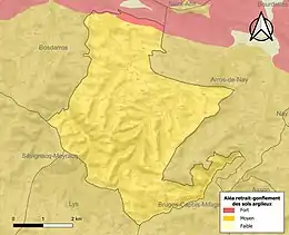 Cet aléa est susceptible d'engendrer des dommages importants aux bâtiments en cas d’alternance de périodes de sécheresse et de pluie[29]. La totalité de la commune est en aléa moyen ou fort (59 % au niveau départemental et 48,5 % au niveau national)[Carte 4]. Depuis le , en application de la loi ELAN, différentes contraintes s'imposent aux vendeurs, maîtres d'ouvrages ou constructeurs de biens situés dans une zone classée en aléa moyen ou fort[Note 7],[30].