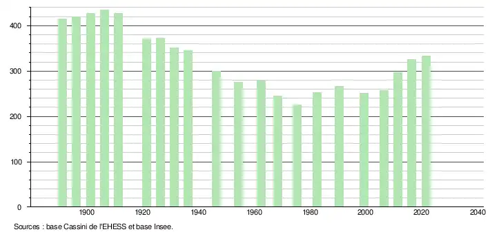 L'évolution du nombre d'habitants est connue à travers les recensements de la population effectués dans la commune depuis 1891. Pour les communes de moins de 10 000 habitants, une enquête de recensement portant sur toute la population est réalisée tous les cinq ans, les populations légales des années intermédiaires étant quant à elles estimées par interpolation ou extrapolation[34]. Pour la commune, le premier recensement exhaustif entrant dans le cadre du nouveau dispositif a été réalisé en 2006[35].