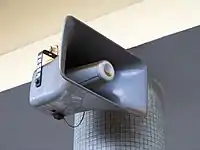 Un haut-parleur à pavillon est un haut-parleur ou un élément de haut-parleur qui utilise un pavillon acoustique pour augmenter l'efficacité globale du ou des éléments d'entraînement. Une forme courante (figure à droite) consiste en un moteur à chambre de compression qui produit des ondes sonores à l'aide d'un petit diaphragme métallique mis en vibration par un électroaimant, fixé à un pavillon, un conduit évasé pour conduire les ondes sonores à l'air libre. Un autre type est un haut-parleur de graves monté dans une enceinte de haut-parleur qui est divisée par des cloisons internes pour former un conduit évasé en zigzag qui fonctionne comme un pavillon ; ce type est appelé haut-parleur à pavillon replié. Le pavillon sert à améliorer l'efficacité du couplage entre le haut-parleur et l'air. Le pavillon peut être considéré comme un « transformateur acoustique » qui assure l'adaptation d'impédance entre le matériau relativement dense du diaphragme et l'air moins dense. Il en résulte une plus grande puissance de sortie acoustique pour un haut-parleur donné[1].