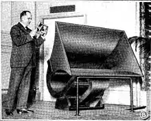 Le principal avantage des haut-parleurs à pavillon est qu'ils sont plus efficaces ; ils peuvent généralement produire environ 3 fois (10 dB)[3],[4],[5] plus de puissance sonore qu'un haut-parleur conique à partir d'une sortie d'amplificateur donnée. Par conséquent, les pavillons sont largement utilisés dans les systèmes de sonorisation, les mégaphones et les systèmes de sonorisation pour les grandes salles comme les théâtres, les auditoriums et les stades de sport. Leur inconvénient est que leur réponse en fréquence est plus irrégulière en raison des pics de résonance, et que les pavillons ont une fréquence de coupure en dessous de laquelle leur réponse chute. (La fréquence de coupure correspond à la longueur d'onde égale à la circonférence de la bouche du pavillon[6]). Pour obtenir une réponse adéquate aux basses fréquences, les haut-parleurs à pavillon doivent être très grands et encombrants, ils sont donc plus souvent utilisés pour les moyennes et hautes fréquences. Les premiers haut-parleurs pratiques, introduits au début du XXe siècle, étaient des haut-parleurs à pavillon. En raison du développement, au cours des dernières décennies, des haut-parleurs à cône, qui ont parfois une réponse en fréquence plus plate, et de la disponibilité d'amplificateurs peu coûteux, l'utilisation des haut-parleurs à pavillon dans les systèmes audio haute fidélité a diminué au cours des dernières décennies.