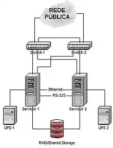 - la mise en place d'une infrastructure matérielle spécialisée, généralement en se basant sur de la redondance matérielle. Est alors créé un cluster de haute-disponibilité (par opposition à un cluster de calcul) : une grappe d'ordinateurs dont le but est d'assurer un service en évitant au maximum les indisponibilités ;