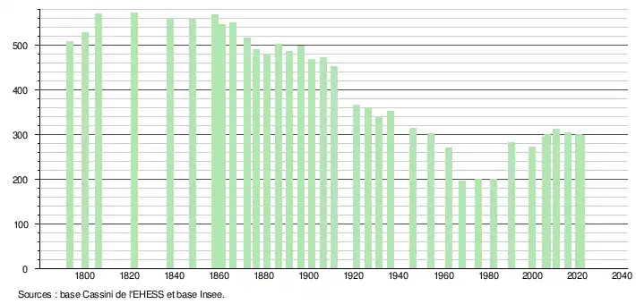 L'évolution du nombre d'habitants est connue à travers les recensements de la population effectués dans la commune depuis 1793. Pour les communes de moins de 10 000 habitants, une enquête de recensement portant sur toute la population est réalisée tous les cinq ans, les populations légales des années intermédiaires étant quant à elles estimées par interpolation ou extrapolation[14]. Pour la commune, le premier recensement exhaustif entrant dans le cadre du nouveau dispositif a été réalisé en 2005[15].