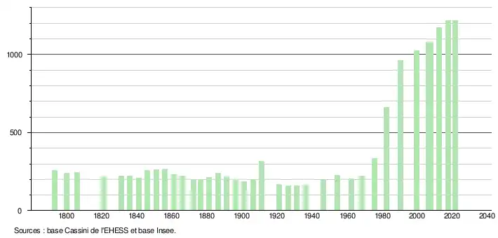 L'évolution du nombre d'habitants est connue à travers les recensements de la population effectués dans la commune depuis 1793. Pour les communes de moins de 10 000 habitants, une enquête de recensement portant sur toute la population est réalisée tous les cinq ans, les populations légales des années intermédiaires étant quant à elles estimées par interpolation ou extrapolation[15]. Pour la commune, le premier recensement exhaustif entrant dans le cadre du nouveau dispositif a été réalisé en 2007[16].
