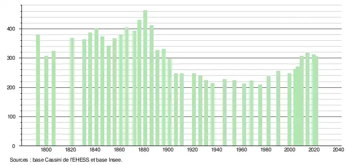 L'évolution du nombre d'habitants est connue à travers les recensements de la population effectués dans la commune depuis 1793. Pour les communes de moins de 10 000 habitants, une enquête de recensement portant sur toute la population est réalisée tous les cinq ans, les populations légales des années intermédiaires étant quant à elles estimées par interpolation ou extrapolation[26]. Pour la commune, le premier recensement exhaustif entrant dans le cadre du nouveau dispositif a été réalisé en 2004[27].