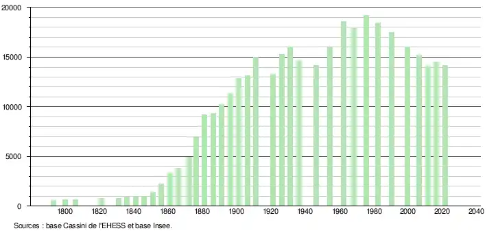 - Par convention dans Wikipédia, le principe a été retenu de n’afficher dans le tableau des recensements et le graphique, pour les populations légales postérieures à 1999, que les populations correspondant à une enquête exhaustive de recensement pour les communes de moins de 10 000 habitants, et que les populations des années 2006, 2011, 2016, etc. pour les communes de plus de 10 000 habitants, ainsi que la dernière population légale publiée par l’Insee pour l'ensemble des communes.