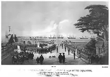 - « Aussitôt, après la signature de l'échange du traité, le commodore Perry accueillit le premier représentant, le prince Hayashi, avec un drapeau américain en indiquant que ce cadeau était la plus haute expression de la courtoisie et de l'amitié nationales qu'il pouvait offrir. Le prince fut profondément touché et exprima sa gratitude. Le commodore accueillit ensuite les autres représentants avec des cadeaux qu'il leur avait spécialement réservés. Toutes les affaires ayant été conclues à la satisfaction des deux parties, les représentants japonais invitèrent Perry et ses officiers à un festin et des divertissements spécialement préparés pour l'occasion. » Récit de témoins américains[6].