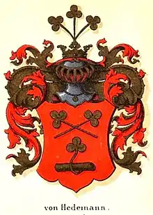Les armoiries de Hedemann-Heespen, décerné en 1776, montre dans un bouclier fendu les armoiries Hedemannsch avec les trois branches de trèfle à l'avant, les armoiries von Heespen à l'arrière: en quartiers avec un bouclier cardiaque divisé du rouge sur l'argent, en elle un chevron de teinture confuse, sous lequel se trouve une rose rouge à six feuilles ensemencée d'or. Le champ I du bouclier principal est divisé par l'or et l'or; la moitié de l'aigle impérial à deux têtes s'appuie contre la ligne fendue, couronnée d'une couronne ouverte et tenant un sceptre et une épée dans sa griffe. Le champ IV est le même, seule la moitié gauche de l'aigle impérial, qui tient l'orbe ici, s'appuie contre l'écart. Les panneaux II et III montrent en noir un lion d'or couronné, à double queue et tourné vers l'intérieur tenant une étoile d'argent à huit branches dans ses pattes. Deux heaumes couronnés, dont l'un a trois trèfles dorés poussant sur de longues tiges dorées, les extérieurs courbés vers l'extérieur ; le deuxième casque montre un aigle bicéphale noir couronné sur les deux têtes d'une noble couronne d'or, tenant une épée à droite et un orbe à gauche. Les couvre-casques sont rouge-or et noir-or. Un aigle noir à droite et un lion d'or à gauche servent de porte-boucliers, à la fois de face et couronnés.