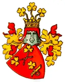 Les armoiries de la famille montrent des branches dorées croisées en rouge, chacune avec une feuille de trèfle dorée en croissance sur une courte tige dorée, sous une branche dorée couchée en travers avec une feuille de trèfle dorée. Sur le casque couronné se trouvent trois trèfles dorés sur des tiges dorées, les externes courbées vers l'extérieur. Les lambrequins sont rouges et dorés[3].