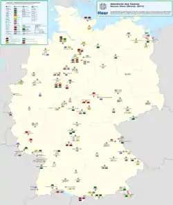 L'Armée de terre allemande est commandée par un chef d'état-major de l'Armée de terre (Inspekteur des Heeres) basé au ministère fédéral de la Défense à Berlin et Bonn. Les commandements majeurs sont le « Bureau des armées allemandes » dans la Barnim Kasern de Strausberg depuis 2014 (auparavant Cologne)[9] et le « commandement des Forces armées allemandes » à Coblence. En 2002, un nombre d'unités et de ses personnels sont transférés vers des nouvelles formations communes : la Base des forces armées (de) (SKB ou Service central des supports) et le Sanitätsdienst (de) (Service central médical)[10].
