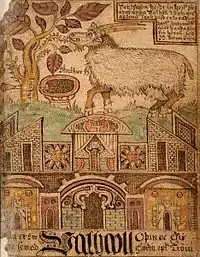 A goat called Heiðrún stands up [on its hind-legs] in Valhalla biting the buds off the branches of that very famous tree which is called Læradr. From her teats runs the mead with which every day she fills a cauldron, which is so big that all the Einherjar can drink their fill from it. - Young's translation |