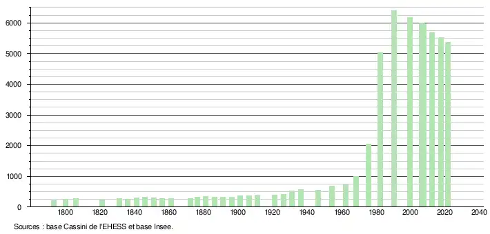 L'évolution du nombre d'habitants est connue à travers les recensements de la population effectués dans la commune depuis 1793. Pour les communes de moins de 10 000 habitants, une enquête de recensement portant sur toute la population est réalisée tous les cinq ans, les populations légales des années intermédiaires étant quant à elles estimées par interpolation ou extrapolation[20]. Pour la commune, le premier recensement exhaustif entrant dans le cadre du nouveau dispositif a été réalisé en 2007[21].