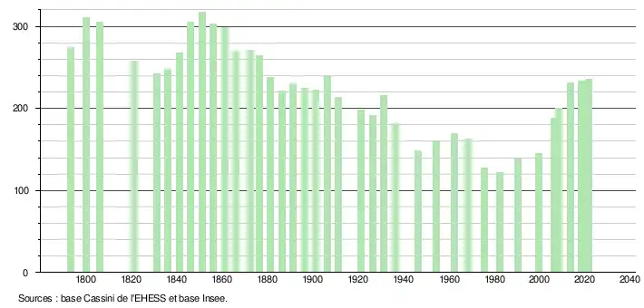 L'évolution du nombre d'habitants est connue à travers les recensements de la population effectués dans la commune depuis 1793. Pour les communes de moins de 10 000 habitants, une enquête de recensement portant sur toute la population est réalisée tous les cinq ans, les populations légales des années intermédiaires étant quant à elles estimées par interpolation ou extrapolation[23]. Pour la commune, le premier recensement exhaustif entrant dans le cadre du nouveau dispositif a été réalisé en 2008[24].