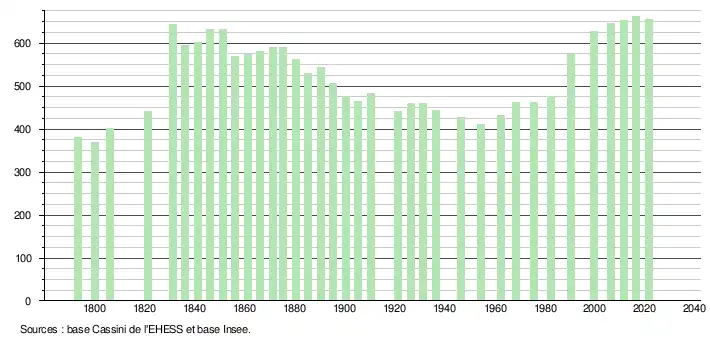 L'évolution du nombre d'habitants est connue à travers les recensements de la population effectués dans la commune depuis 1793. Pour les communes de moins de 10 000 habitants, une enquête de recensement portant sur toute la population est réalisée tous les cinq ans, les populations légales des années intermédiaires étant quant à elles estimées par interpolation ou extrapolation[16]. Pour la commune, le premier recensement exhaustif entrant dans le cadre du nouveau dispositif a été réalisé en 2006[17].