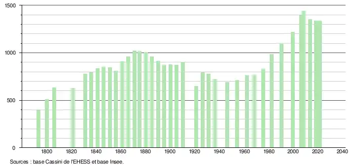 L'évolution du nombre d'habitants est connue à travers les recensements de la population effectués dans la commune depuis 1793. Pour les communes de moins de 10 000 habitants, une enquête de recensement portant sur toute la population est réalisée tous les cinq ans, les populations légales des années intermédiaires étant quant à elles estimées par interpolation ou extrapolation[20]. Pour la commune, le premier recensement exhaustif entrant dans le cadre du nouveau dispositif a été réalisé en 2008[21].