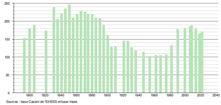L'évolution du nombre d'habitants est connue à travers les recensements de la population effectués dans la commune depuis 1793. Pour les communes de moins de 10 000 habitants, une enquête de recensement portant sur toute la population est réalisée tous les cinq ans, les populations légales des années intermédiaires étant quant à elles estimées par interpolation ou extrapolation[16]. Pour la commune, le premier recensement exhaustif entrant dans le cadre du nouveau dispositif a été réalisé en 2008[17].