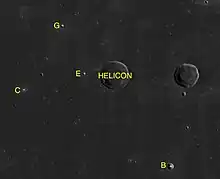 Le cratère Helicon possède un certain nombre de cratères satellites identifiés avec des lettres.
