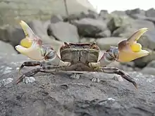 Hemigrapsus sanguineus est un petit crabe originaire d'Asie des côtes rocheuses du Japon et de la Chine.