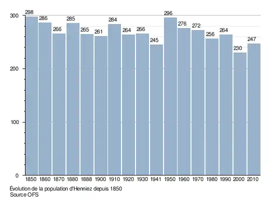 La population d'Henniez est de 298 habitants en 1850. Elle baisse à 245 habitants en 1941, puis augmente à 296 habitants en 1950. Elle baisse légèrement depuis jusqu'à 230 habitants en 2000. Le graphique suivant résume l'évolution de la population d'Henniez entre 1850 et 2010[13] :