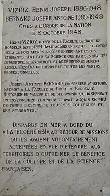 A la faculté de droit de Bordeaux, un amphithéâtre porte le nom d'Henry Vizioz, ainsi que plusieurs rues de la Métropole. Une plaque commémore dans le hall d'entrée de la Faculté de droit, place Pey-Berland, la disparition en mer des professeurs Vizioz et Bernard.
