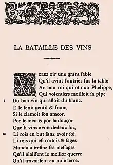 - Connu aussi sous le titre de Dit des vins de France, ce poème composé peu après 1224, en 204 vers, constitue un inappréciable témoignage sur le vignoble français du XIIIe siècle. Il se déroule à la table du roi de France Philippe-Auguste, qui a envoyé partout ses messagers rassembler les meilleurs vins blancs, pour en établir la hiérarchie. Un prêtre anglais, revêtu de l’étole, et dont le français fortement anglicisé est supposé produire un effet comique, déguste les vins qui lui sont présentés, excommunie ou chasse à coups de bâton les mauvais vins. Ceux qui restent en lice ne tardent pas à se disputer la préséance et, dit le poète, ils en seraient venus aux mains si les vins avaient des mains.