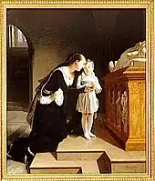 Le tableau[4] dépeint Jeanne de Navarre, fille de Charles II (roi de Navarre), veuve de Jean IV duc de Bretagne mort en 1399, dont elle fut la troisième épouse. Future reine d'Angleterre, elle figure sur ce tableau avec son second fils, Arthur, futur duc de Bretagne. Cette peinture est décrite comme exemplifiant la mère, dans la mesure où la duchesse remplit son devoir d'éducation envers son fils et lui apprend la piété filiale.