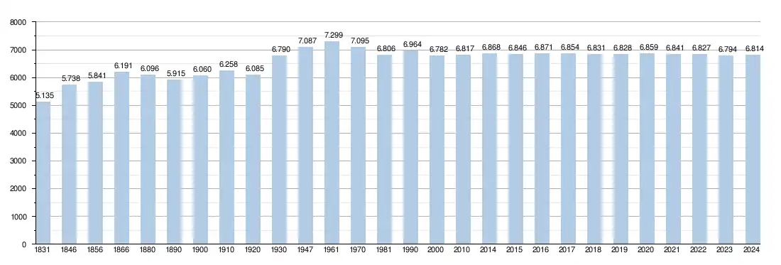 Elle comptait, au , 6 831 habitants (3 273 hommes et 3 558 femmes) [3], soit une densité de 258,65 habitants/km² pour une superficie de 26,41 km²[4].