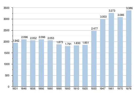 Les chiffres des années 1831 à 1970 tiennent compte des chiffres des anciennes communes fusionnées.