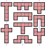 - 9 heptaminos (colorés en rouge) ont un axe de symétrie aligné avec le quadrillage. Leur groupe de symétrie comporte deux éléments, l'identité et une symétrie dont l'axe passe par une médiane d'un carré.