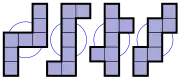 Cependant, l'ensemble des 107 heptaminos libres simplement connexes - c'est-à-dire ceux qui n'ont pas de trou - peut carreler un rectangle de 7 x 107 (749 carrés)[6]. En outre, l'ensemble complet d'heptaminos libres peut carreler trois rectangles de 11 sur 23 (253 carrés), chacun avec un trou d'un carré au centre ; l'ensemble complet peut également carreler douze carrés de 8 sur 8 (64 carrés) avec un trou d'un carré au centre[7].