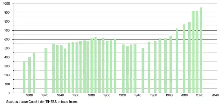 L'évolution du nombre d'habitants est connue à travers les recensements de la population effectués dans la commune depuis 1793. Pour les communes de moins de 10 000 habitants, une enquête de recensement portant sur toute la population est réalisée tous les cinq ans, les populations légales des années intermédiaires étant quant à elles estimées par interpolation ou extrapolation[18]. Pour la commune, le premier recensement exhaustif entrant dans le cadre du nouveau dispositif a été réalisé en 2006[19].