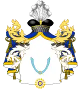 Écartelé, au premier des comtes-sénateurs ; au deuxième d'or à la croix de gueules ; au troisième d'argent à la croix de sable, cantonnée de quatre losange du même ; au quatrième d'azur au cigne nageant d'argent ; sur le tout de gueules à trois barres d'or, au comble d'azur, chargé de trois étoiles d'argent.[7],[4] |