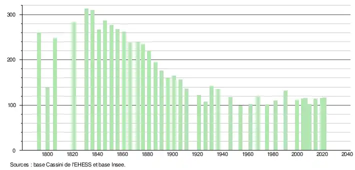 L'évolution du nombre d'habitants est connue à travers les recensements de la population effectués dans la commune depuis 1793. Pour les communes de moins de 10 000 habitants, une enquête de recensement portant sur toute la population est réalisée tous les cinq ans, les populations légales des années intermédiaires étant quant à elles estimées par interpolation ou extrapolation[26]. Pour la commune, le premier recensement exhaustif entrant dans le cadre du nouveau dispositif a été réalisé en 2004[27].