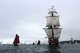 L'Hermione toutes voiles dehors lors de sa première navigation en 2014. | |