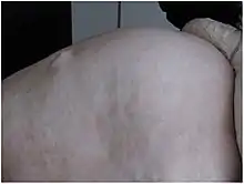 Plus rarement, la tuméfaction herniaire est plus importante, avec un collet (portion rétrécie où passe le sac herniaire à travers l'orifice herniaire) de 3 à 5 cm. Elle contient le plus souvent de l'épiploon. Les douleurs sont alors plus nettes, et la tuméfaction est impulsive (au toucher) et expansive (à la vue) à la toux[1].