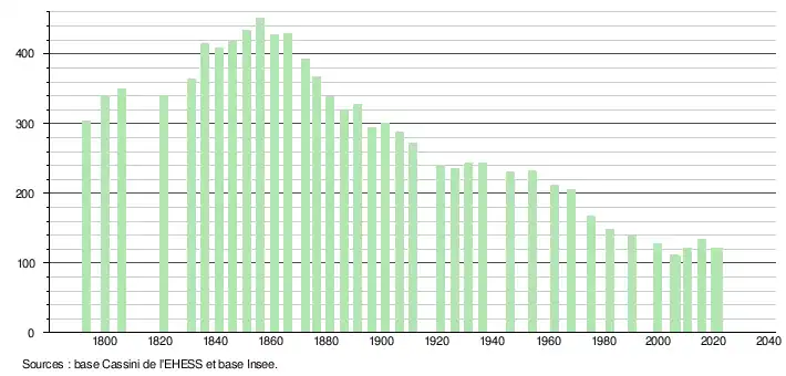 L'évolution du nombre d'habitants est connue à travers les recensements de la population effectués dans la commune depuis 1793. Pour les communes de moins de 10 000 habitants, une enquête de recensement portant sur toute la population est réalisée tous les cinq ans, les populations légales des années intermédiaires étant quant à elles estimées par interpolation ou extrapolation[18]. Pour la commune, le premier recensement exhaustif entrant dans le cadre du nouveau dispositif a été réalisé en 2005[19].