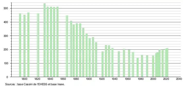 L'évolution du nombre d'habitants est connue à travers les recensements de la population effectués dans la commune depuis 1793. Pour les communes de moins de 10 000 habitants, une enquête de recensement portant sur toute la population est réalisée tous les cinq ans, les populations légales des années intermédiaires étant quant à elles estimées par interpolation ou extrapolation[19]. Pour la commune, le premier recensement exhaustif entrant dans le cadre du nouveau dispositif a été réalisé en 2004[20].
