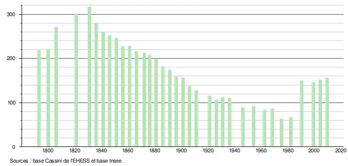 L'évolution du nombre d'habitants est connue à travers les recensements de la population effectués dans la commune depuis 1793. À partir du , les populations légales des communes sont publiées annuellement dans le cadre d'un recensement qui repose désormais sur une collecte d'information annuelle, concernant successivement tous les territoires communaux au cours d'une période de cinq ans. Pour les communes de moins de 10 000 habitants, une enquête de recensement portant sur toute la population est réalisée tous les cinq ans, les populations légales des années intermédiaires étant quant à elles estimées par interpolation ou extrapolation[14]. Pour la commune, le premier recensement exhaustif entrant dans le cadre du nouveau dispositif a été réalisé en 2004[15],[Note 2].