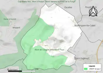 Le territoire communal comprend une ZNIEFF de type 1[Note 4] : Le site du Mont de Couples et le Blanc Pays, d’une superficie de 681 hectares et d'une altitude variant de 34 à 161 mètres. Le mont de couple, constitué d’un éperon saillant qui est vaste coteau crayeux, est couvert de pelouses endémiques du Nord de la France : le Thymo britannici - Festucetum hirtulae. Ce mont présente, à son pied, un petit vallon qui abrite encore une prairie inondable[13].