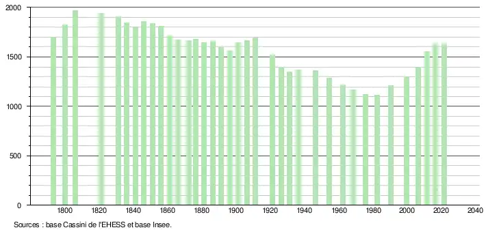 L'évolution du nombre d'habitants est connue à travers les recensements de la population effectués dans la commune depuis 1793. Pour les communes de moins de 10 000 habitants, une enquête de recensement portant sur toute la population est réalisée tous les cinq ans, les populations légales des années intermédiaires étant quant à elles estimées par interpolation ou extrapolation[29]. Pour la commune, le premier recensement exhaustif entrant dans le cadre du nouveau dispositif a été réalisé en 2006[30].