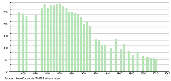 L'évolution du nombre d'habitants est connue à travers les recensements de la population effectués dans la commune depuis 1793. Pour les communes de moins de 10 000 habitants, une enquête de recensement portant sur toute la population est réalisée tous les cinq ans, les populations légales des années intermédiaires étant quant à elles estimées par interpolation ou extrapolation[29]. Pour la commune, le premier recensement exhaustif entrant dans le cadre du nouveau dispositif a été réalisé en 2007[30].