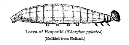 Les chenilles sont cylindriques. Elles ont une grosse tête accentuée par un cou étroit, avec pour certains genres, un « collier » de points blancs ou jaunes, juste derrière la tête. Pour toutes les espèces européennes dont la biologie est connue, les larves vivent protégées dans des feuilles qu'elles enroulent et fixent avec des fils de soie. La structure de ces abris peut se modifier au cours du développement de la larve. Ils servent également de sites d'hivernage (hibernaculum) ou de nymphose.