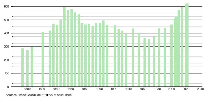 L'évolution du nombre d'habitants est connue à travers les recensements de la population effectués dans la commune depuis 1793. Pour les communes de moins de 10 000 habitants, une enquête de recensement portant sur toute la population est réalisée tous les cinq ans, les populations légales des années intermédiaires étant quant à elles estimées par interpolation ou extrapolation[17]. Pour la commune, le premier recensement exhaustif entrant dans le cadre du nouveau dispositif a été réalisé en 2004[18].