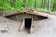 Von Baumhauer prévoit au départ d'utiliser comme cachette la maison d'un forestier derrière la ferme Pas Op ; cependant, le forestier lui fait observer que la maison est trop proche des sentiers pédestres et qu'il faut cacher les gens plus profondément dans la forêt, à l' abri des patrouilles. À partir de mai 1943, les premiers habitants sont logés dans une bergerie et sous une tente, puis un ensemble de douze huttes simples sont construites, certaines à demi émergées du sol, d'autres complètement souterraines ; le camp prend le nom de Pas-op-kamp .
